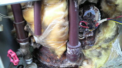 | 逃し弁のドレンと排水管の隙間から湯気が漏れていて本体・継手・温度センサーが錆びてお湯が沸かなくなっていました。対策はドレンと排水管の気密接続が必要です。屋外設置型では問題有りませんがこの場合は設置業者の知識不足が原因でした。 |