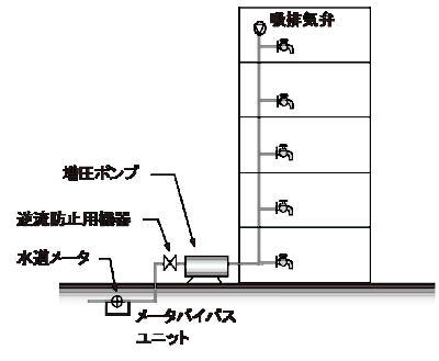 てが認められたことを契機として、平成元年7月から、2階までであった直圧直結給水方式(水道の配水圧力のみで給水する方式)を3階まで拡大した。さらに、平成16 年6月からは、現状の配水圧力で建物最上階の末端給水栓まで直圧直結給水が可能な場合に限り、特例で増圧ポンプなどの設置を留保する直圧直結給水方式(以下「特例直圧直結給水方式」という。)を承認することとした。また、3階以下の建物を直圧直結給水方式へ切り替える場合に、受水タンク以下装置の改造を伴わないものは、例外的に受水タンクから先の配管などをそのまま使用する方式(以下「3階までの例外直圧直結給水方式」という。)ができることとした。平成19 年1月からは、3階までの例外直圧直結給水方式を全ての口径で適用可能とし、特例直圧直結給水方式についても、流量計算における現地水圧の採用、適用口径の拡大、階高制限の撤廃などを実施した。