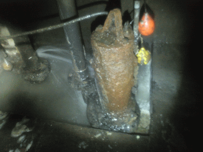 ↑奥に見えるのが2号機で何年も1台で頑張っていたようでしたがいよいよ力尽き停止し排水ピットが一杯になっていました。そこで厄介になってくるのが汚水の撤去です、違うマンホールに汲み上げて流すと犯罪になってしまいますので微かな望みで2号機の電源を何度か操作したところ動いてくれました!本体から水を噴きながらもピット内の汚水を全て排出したところです↑最後の最後まで稼動し全ての役割を終えた2号機に有難うです。