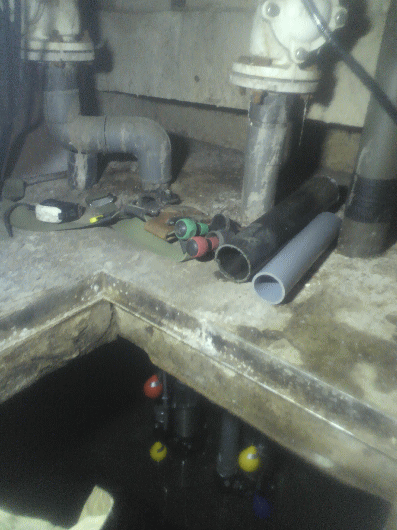 マンション一階の排水の流れがわるいとの事で点検に伺いました。早速、地下汚水槽をのぞくと満水で二階槽まで溢れていましたがココで止まっていて何よりでした。排水異常などの報告が無ければ先ず1階の浴槽やトイレから汚水が逆流するところでした。手前に見えるのが一号機で数年前から止まっていた様で故障の警報装置はうるさいので外されていましたがしかし予想外の修繕費用や事故にがりますので警報は外さないで下さい。(安心して下さい、一時停止は大丈夫です。)
