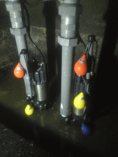 排水ポンプを2台以上、設置する理由は交互自動運転し各負担を減らすと長持ちする事ですがそれ以上に常に排水設備が機能する為の対策になります、修理・交換する場合は部品や後継機の納品が1週間位必要で一台が故障した場合、取り外してから代用ポンプを仮設置して後日、修理または交換し次に動いているポンプも取り外し代用ポンプと入れ代えて点検します、この工程はお客様とご相談して決めていきます。